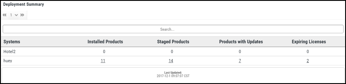 Click an underlined number to view the Systems page and a list of installed products, staged products, products with available updates, or expiring licenses.