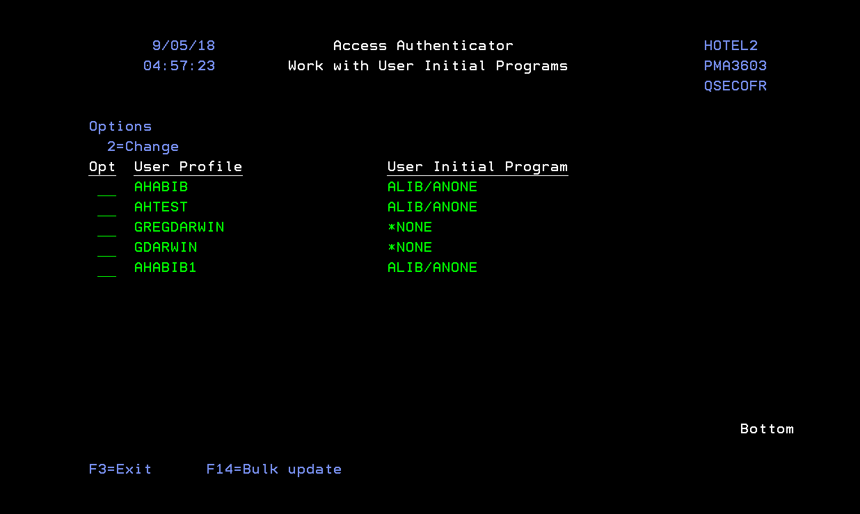 To change the user own initial program in bulk. This function will run an internal command where specific name , generic name or all can be used for user name to change user(s) own initial program setup within Access Authenticator. This key is only valid and will be visible when there are some data to show.