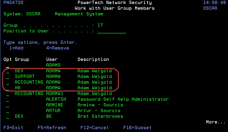 - Press Enter to add the chosen user(s) to the User Group. In the above example, profile ADAMW will be added to the IT User Group.