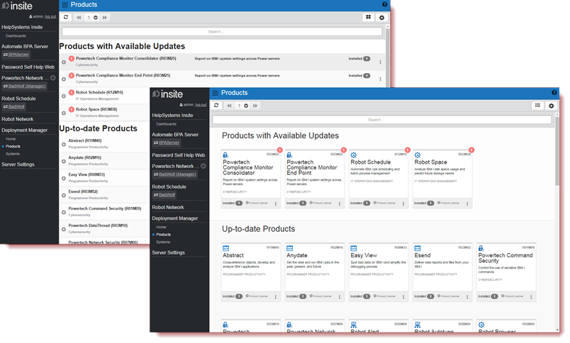 The Products page displays information about the HelpSystems products that are currently installed, available for install, or available for an update. Use this page to install or stage products, check product logs for multiple systems, see a list of applied product licenses, and view a product overview.