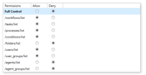 Select the user or group from the Selected Group/User Name pane and for each permission level in the Permissions (bottom) pane, specify whether that user/group should be allowed or denied access to the resource.