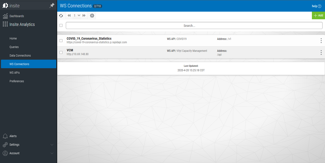in Insite Analytics to display a list of connections like so:See Work with WS Connections for more information about this screen.