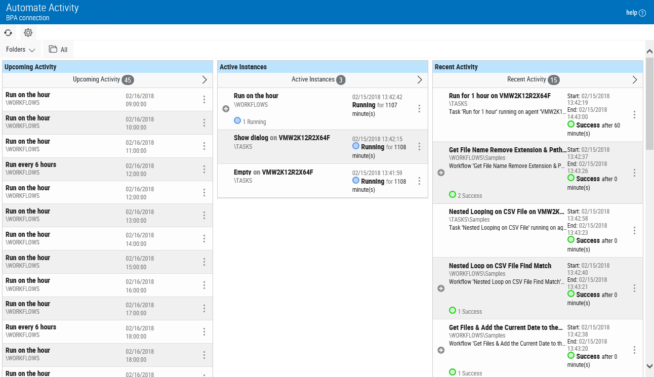 The Automate Activity page provides a visual reference of past, present, and future automation activities. It can be used to forecast upcoming scheduled workflow activities, track progress of active instances to determine whether they are running as expected, and monitor historical performance statistics of recent activities.