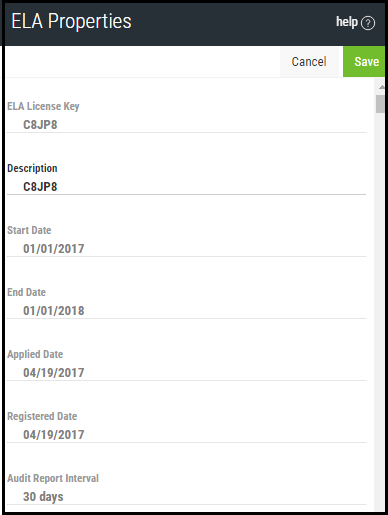 The ELA Properties page contains important information about the ELA license key you selected, such as how long the key will remain active, what date it was applied, and how often an audit report is generated.