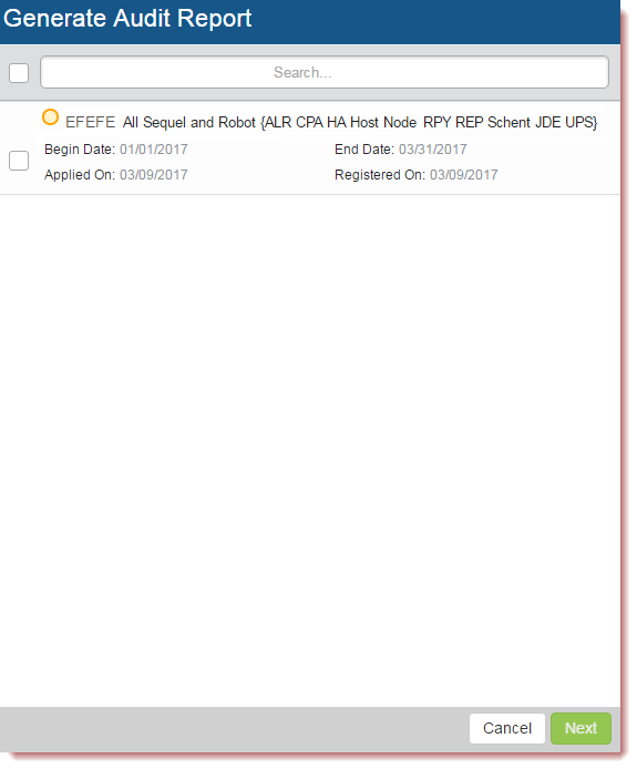 Use the Generate Audit Report screen to select which enterprise licenses you want to generate an audit report for. This screen allows you to select which enterprise licenses you want to generate an audit report for. At a glance, you can see when the licenses began, when they were applied, when they were registered (the date they were added to the ELA), and when they will end.