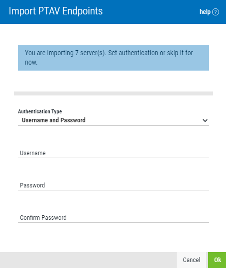 Use these settings to configure how the servers are authenticated. If Username and Password is selected, the following three fields appear: Username, Password, Confirm Password. If SSH Private Key is selected, you are prompted to choose the file containing the key to be uploaded. No Authentication indicates authentication for server import is not required. (Authentication can be set later using Set Authentication.)