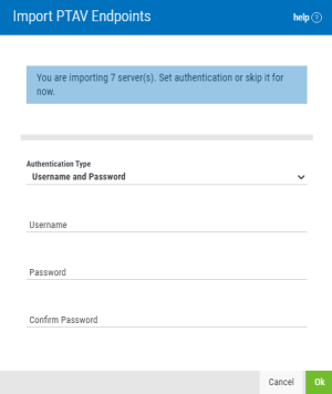 If all the rows in the import file have 4 columns, these fields remain disabled. If at least one row in the import file has 2 columns, the authentication info fields are enabled. Servers whose credentials are not already specified in the import file will use these credentials.