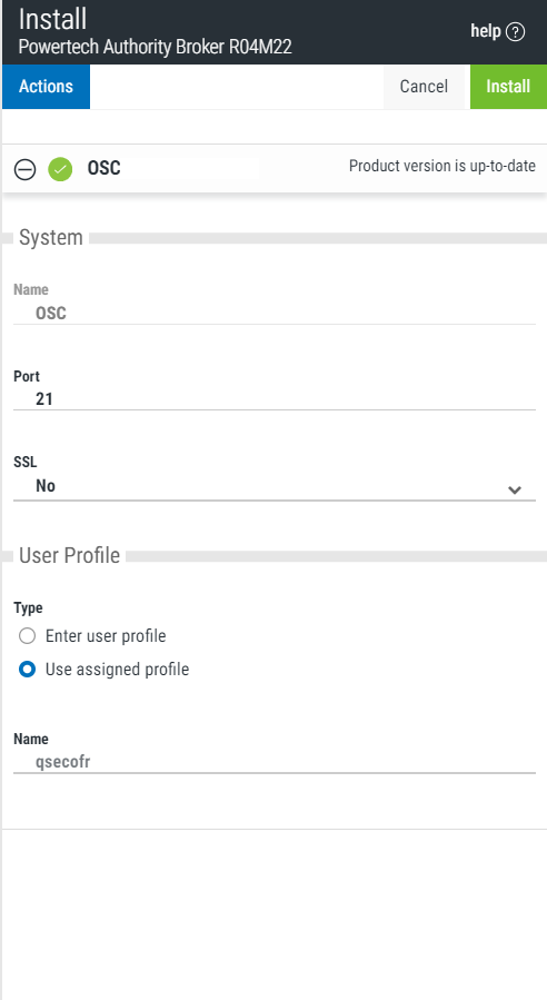 Type: Choose Use Assigned Profile to use the profile assigned to the product connection in Insite. Choose Enter User Profile to specify a different profile for installation.